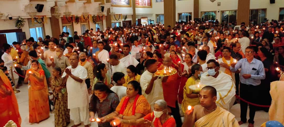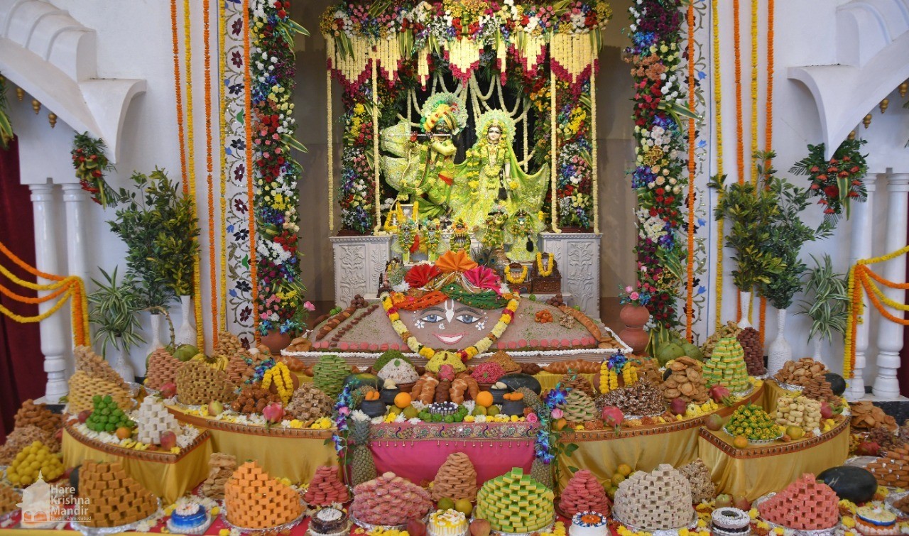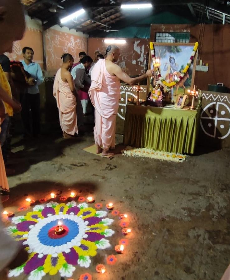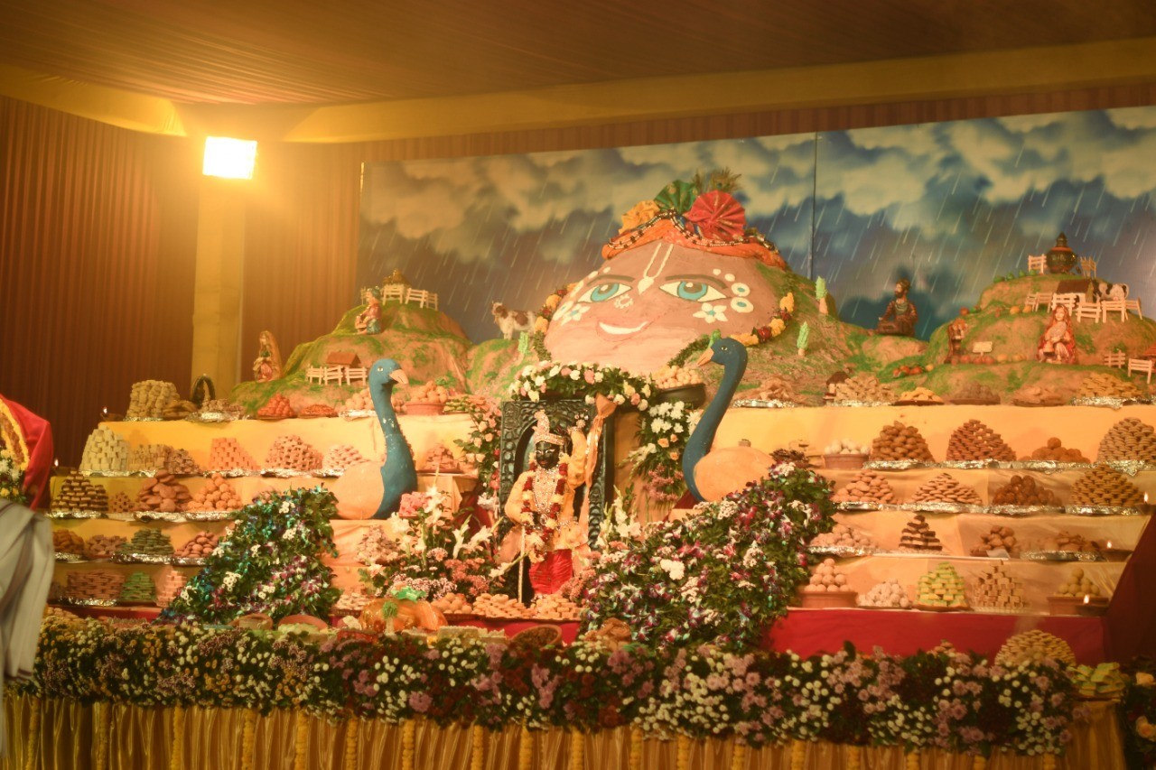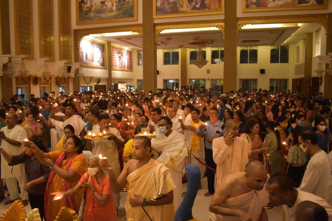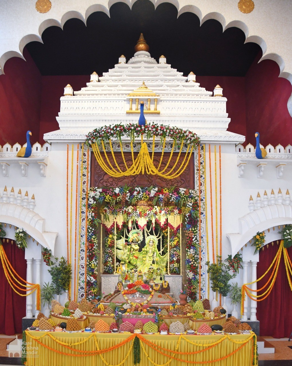 Govardhan Puja was celebrated with great grandeur. The festival included darshan & parikrama of replica of Giriraj Govardhan prepared with pure vegetarian cake & grand annakuta offering; swarna ratha yatra of Sri Sri Radha Madhav; Go-puja at Radha Madhav Gaushala of the temple and Deepotsav with Damodarashtkam bhajan.