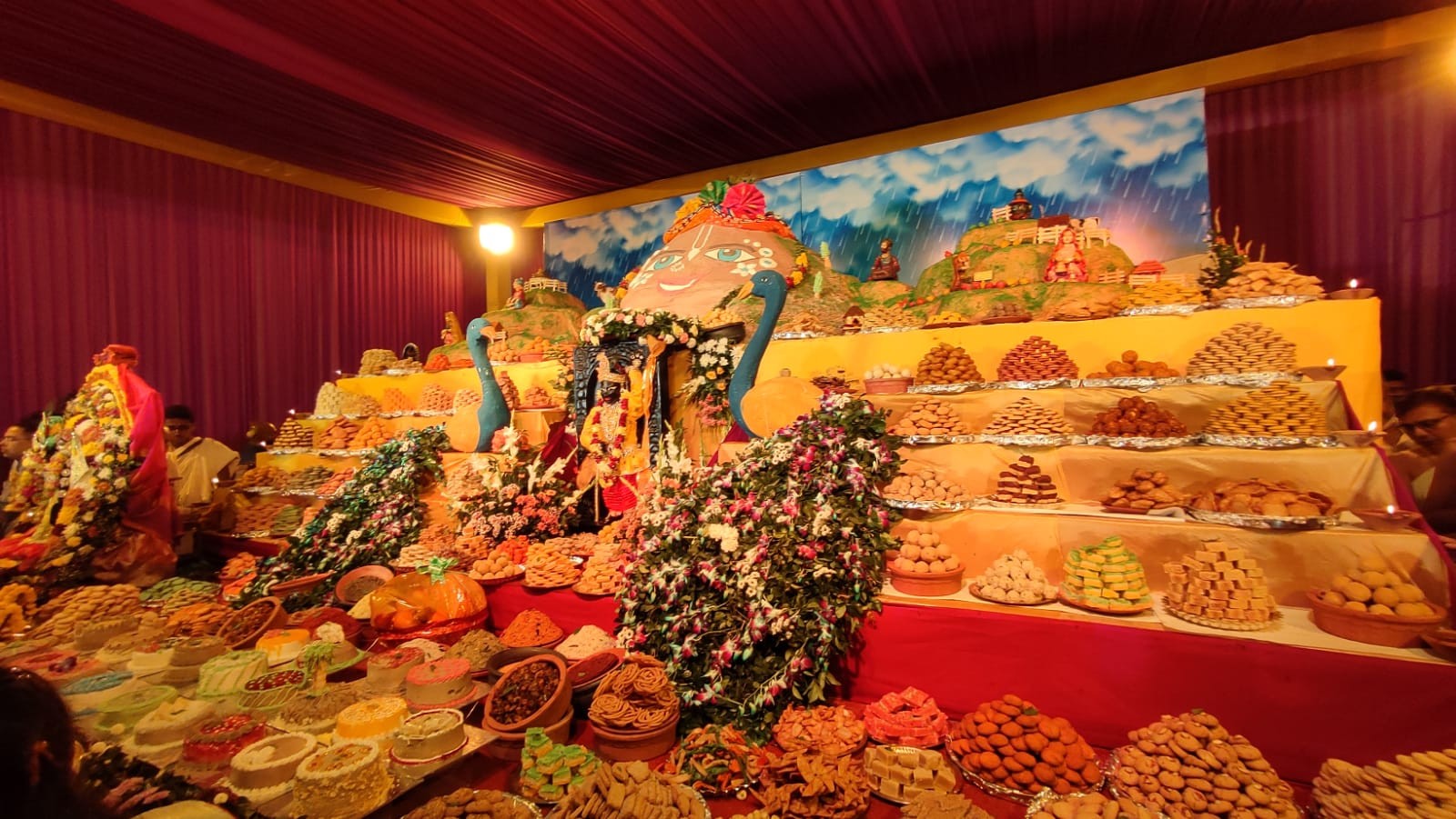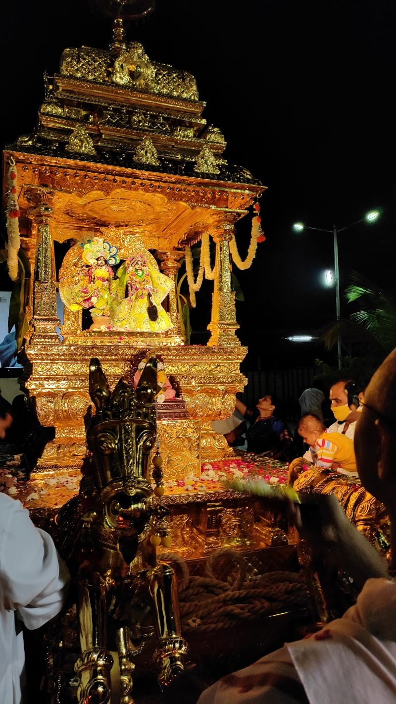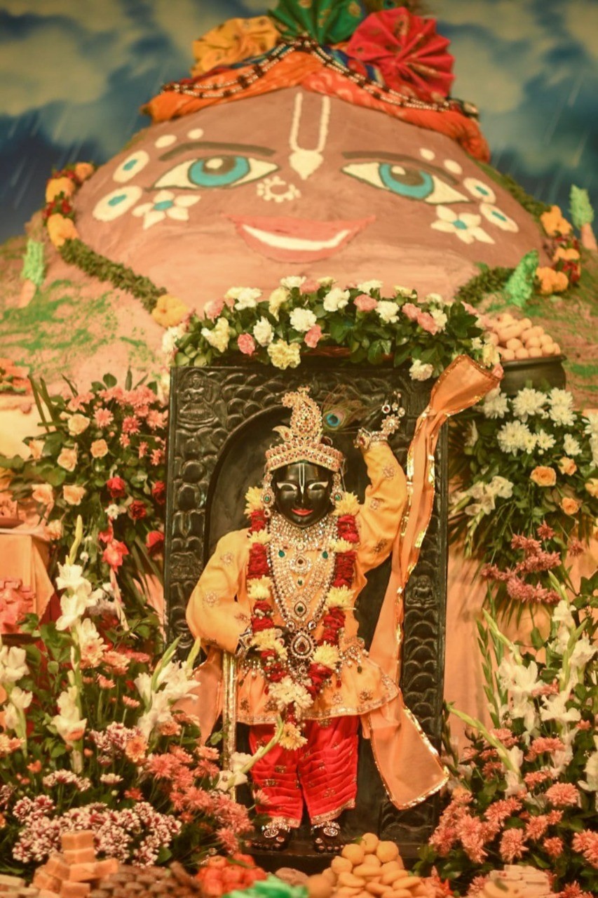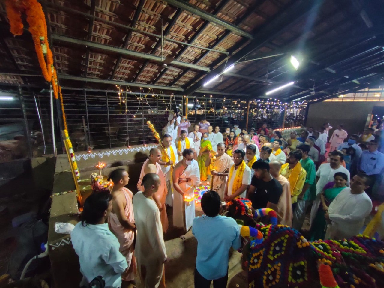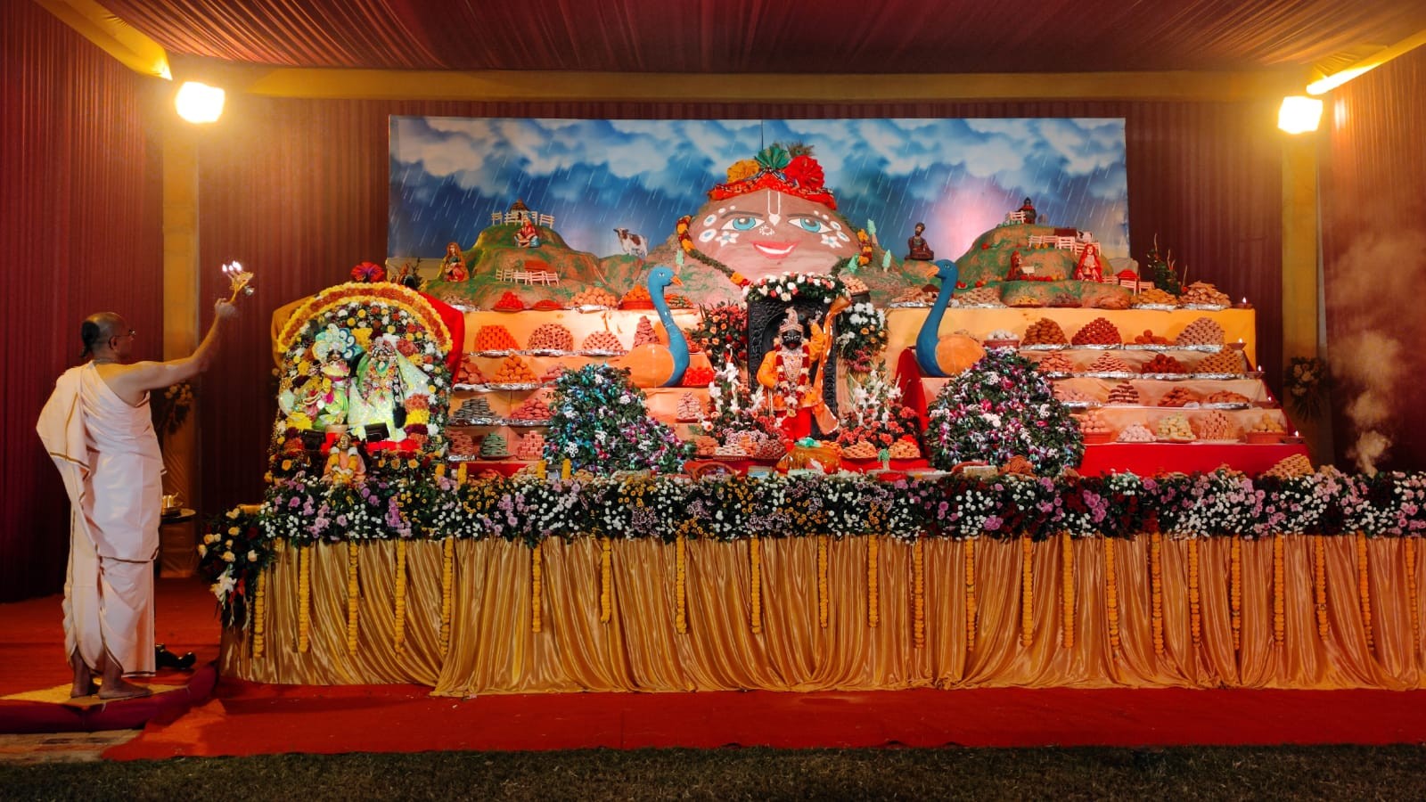 Govardhan Puja was celebrated with great grandeur. The festival included darshan & parikrama of replica of Giriraj Govardhan prepared with pure vegetarian cake & grand annakuta offering; swarna ratha yatra of Sri Sri Radha Madhav; Go-puja at Radha Madhav Gaushala of the temple and Deepotsav with Damodarashtkam bhajan.