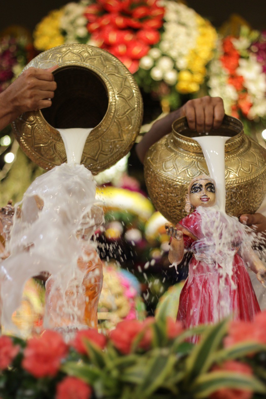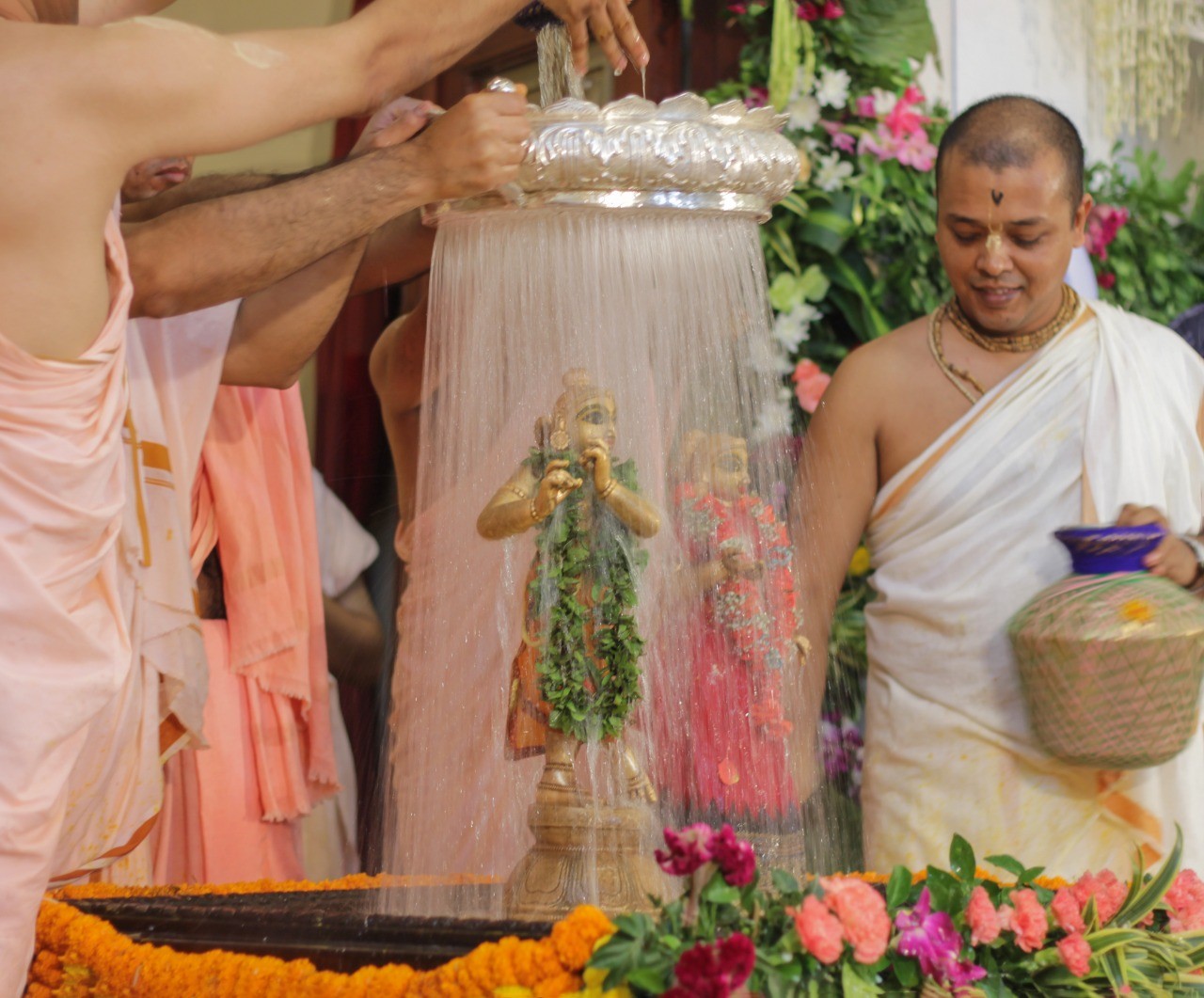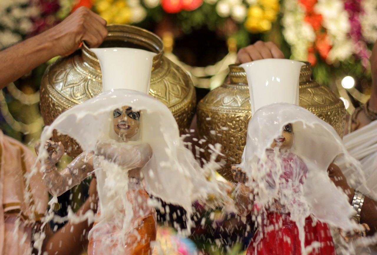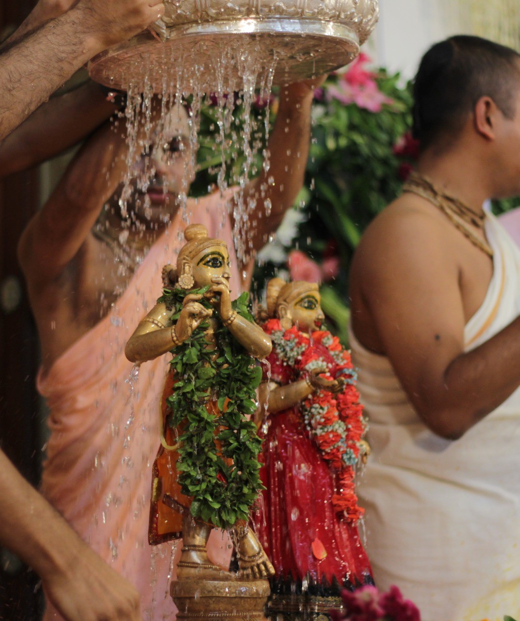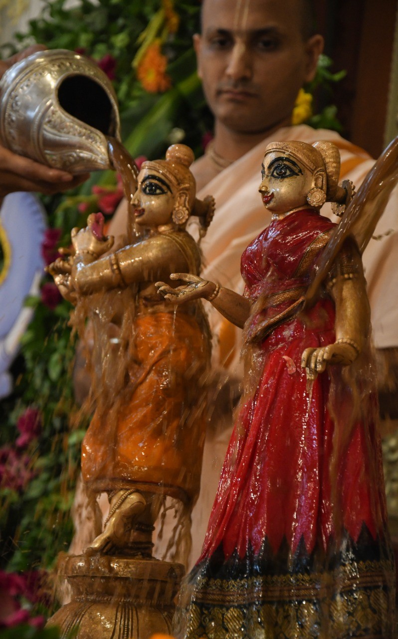 Sri Krishna Janmashtami Celebration at Hare Krishna Mandir Ahmedabad on 30th August, 2021. Abhishekam of Sri Sri Radha Madhav with panchamrita and shodashopchara.