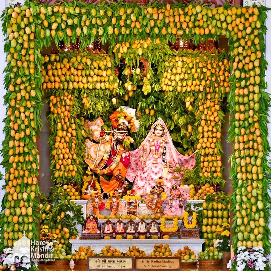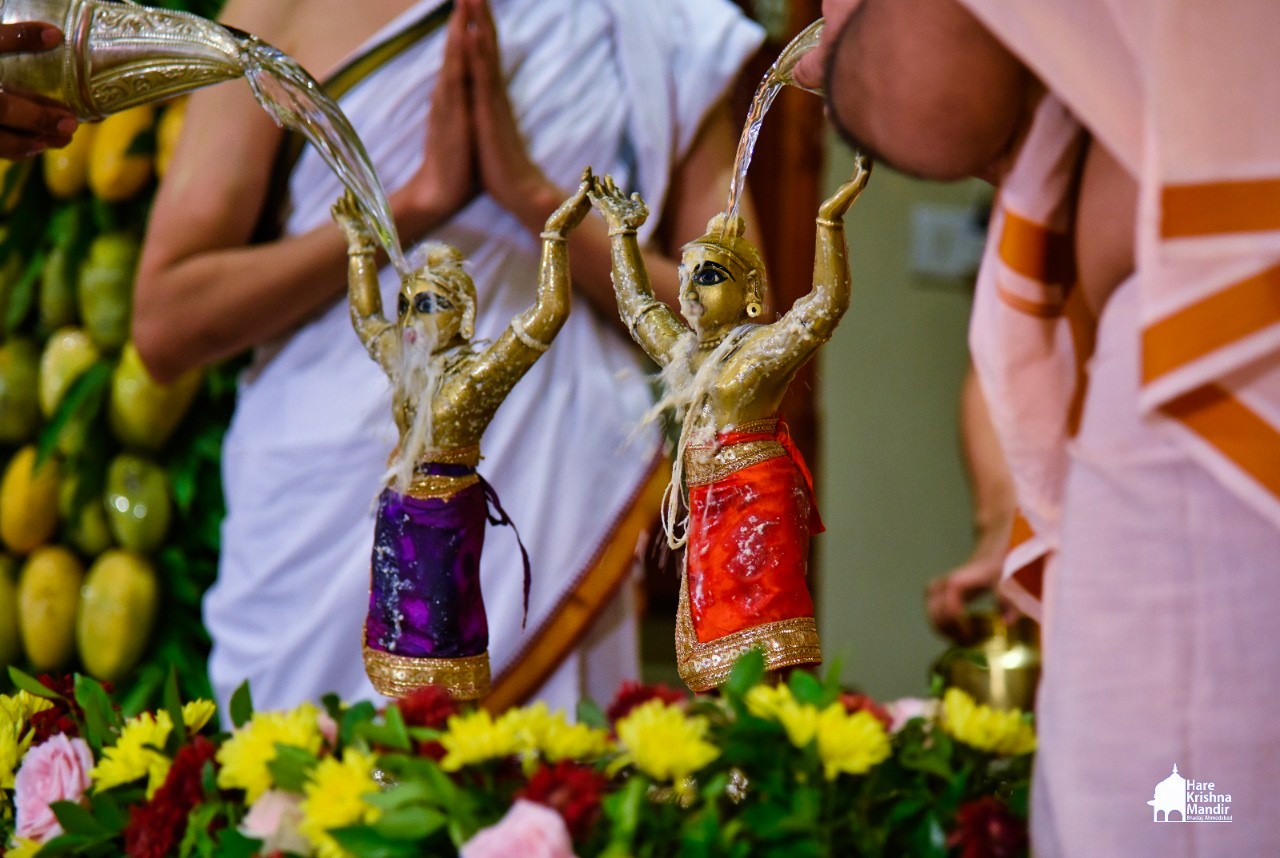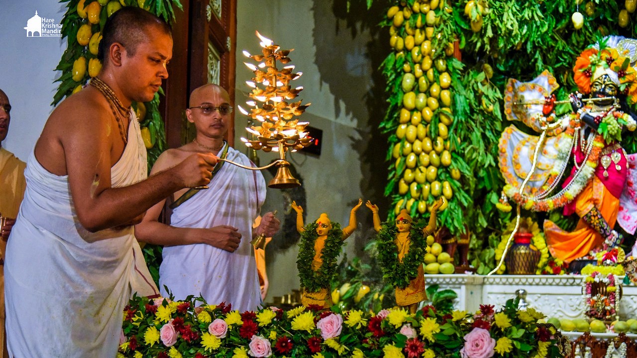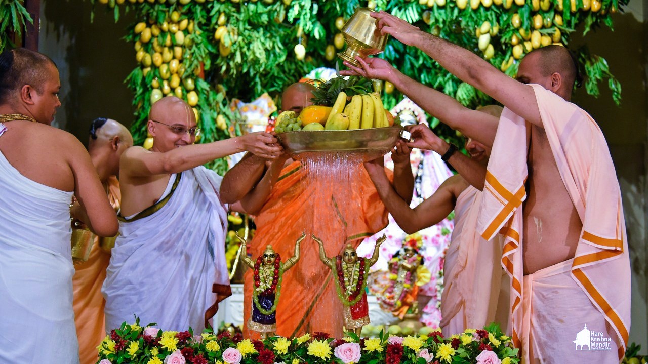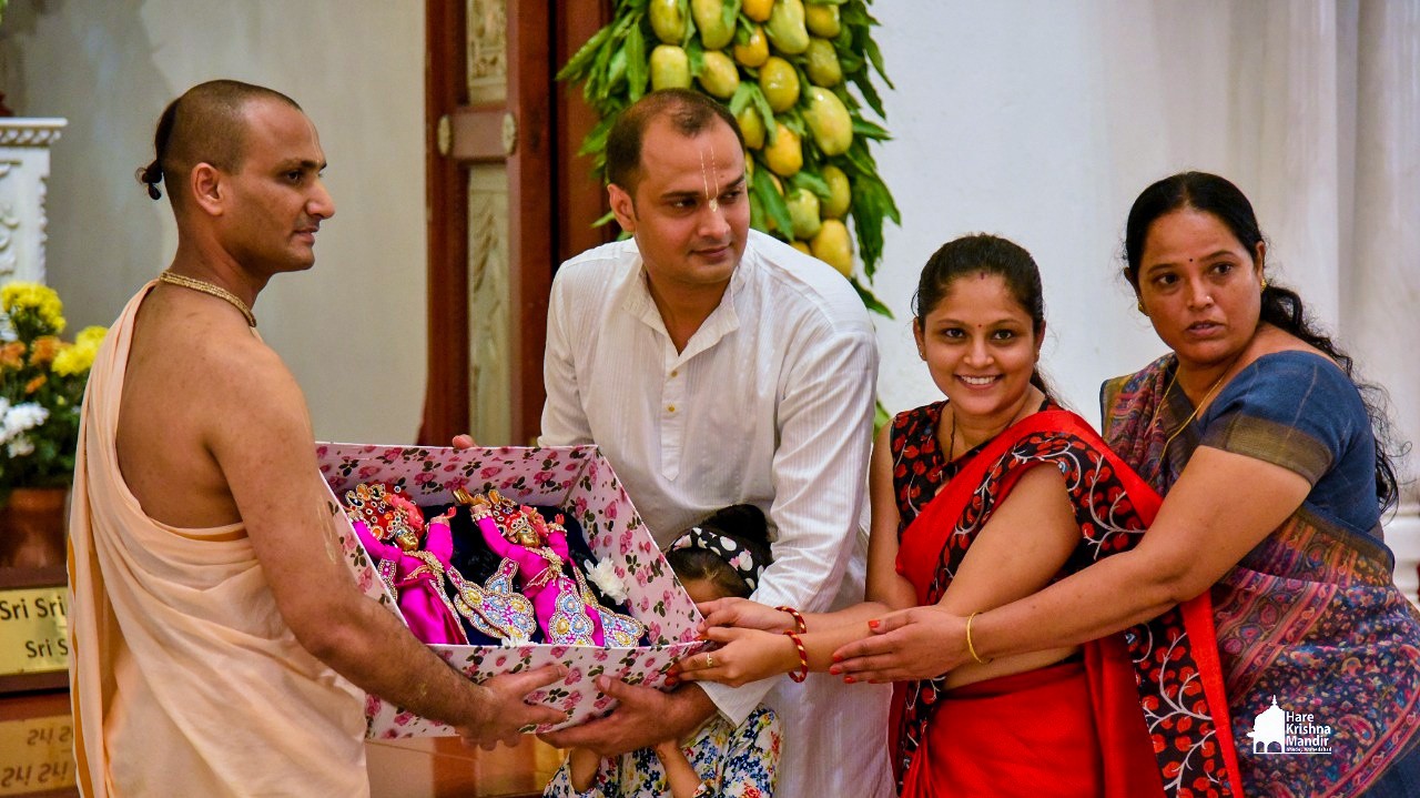 Panihati Chida-dahi Mahotsav - the festival of chipped rice and yoghurt was celebrated at Hare Krishna Movement, Ahmedabad on June 23, 2021. The festivities included Sandhya Arati, followed by Panchamrut Abhishekam of Their Lordships Sri Sri Nitai Gauranga, narration of Panihati festival's glory and pallaki utsav. Three Krishna Ashraya familes received Sri Sri Nitai Gauranga Deities from the temple to worship at their homes.