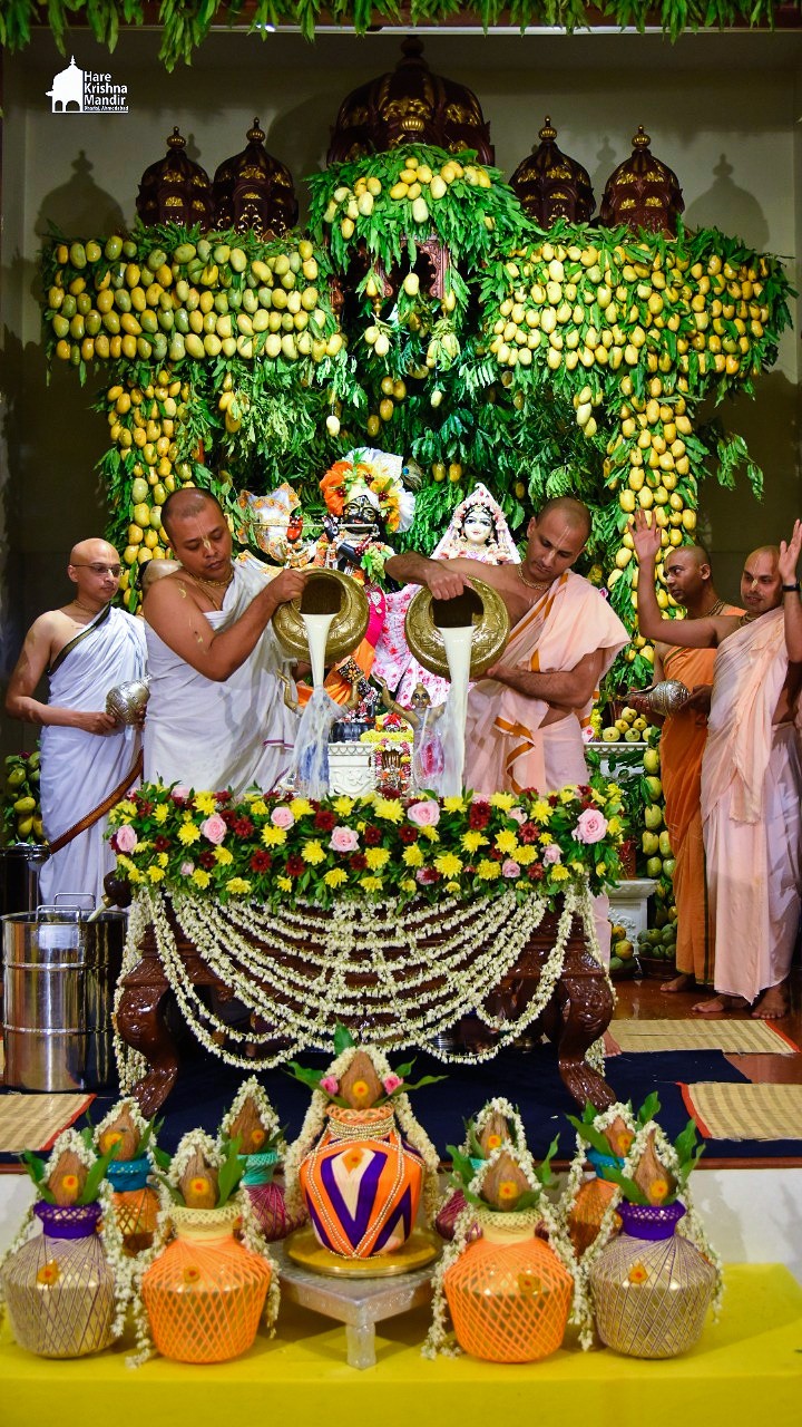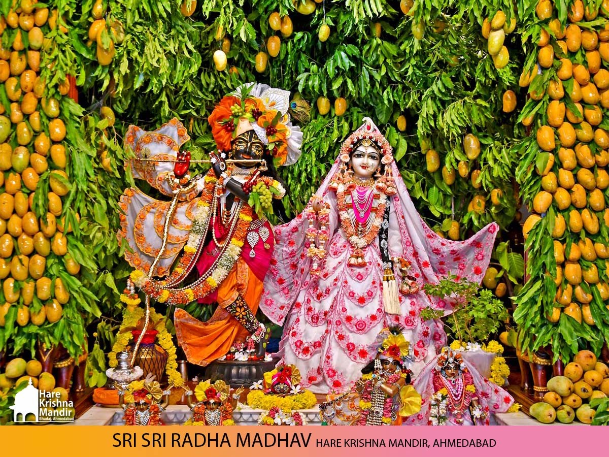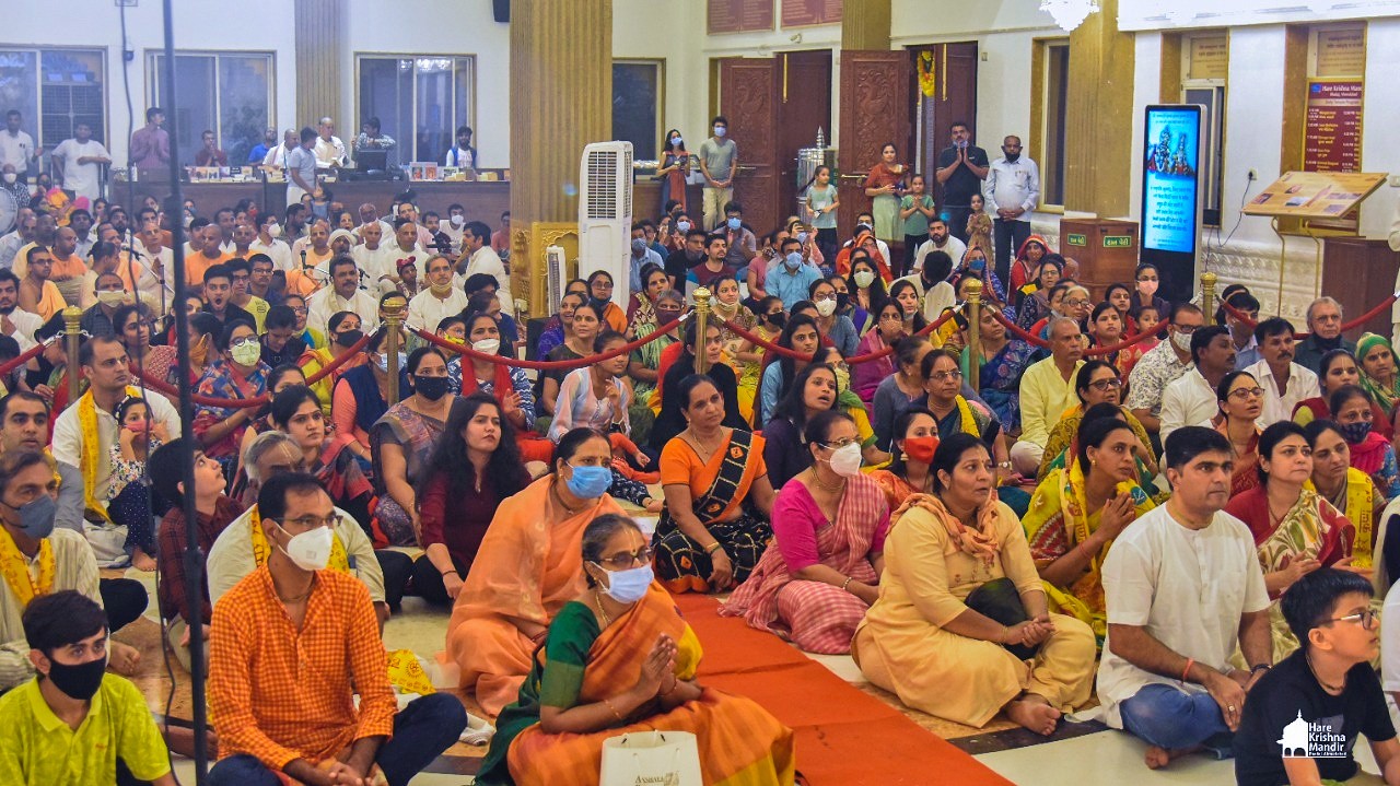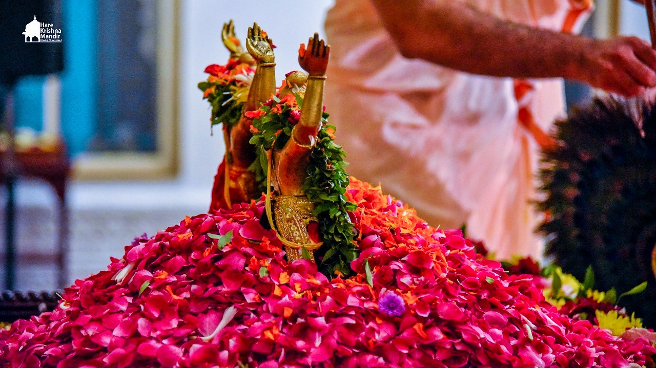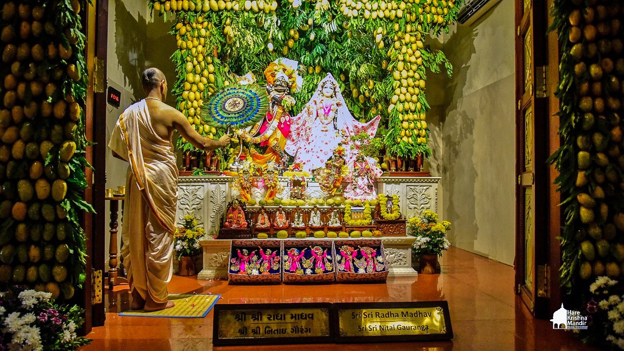 Panihati Chida-dahi Mahotsav - the festival of chipped rice and yoghurt was celebrated at Hare Krishna Movement, Ahmedabad on June 23, 2021. The festivities included Sandhya Arati, followed by Panchamrut Abhishekam of Their Lordships Sri Sri Nitai Gauranga, narration of Panihati festival's glory and pallaki utsav. Three Krishna Ashraya familes received Sri Sri Nitai Gauranga Deities from the temple to worship at their homes.