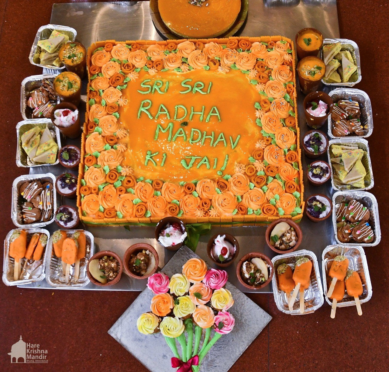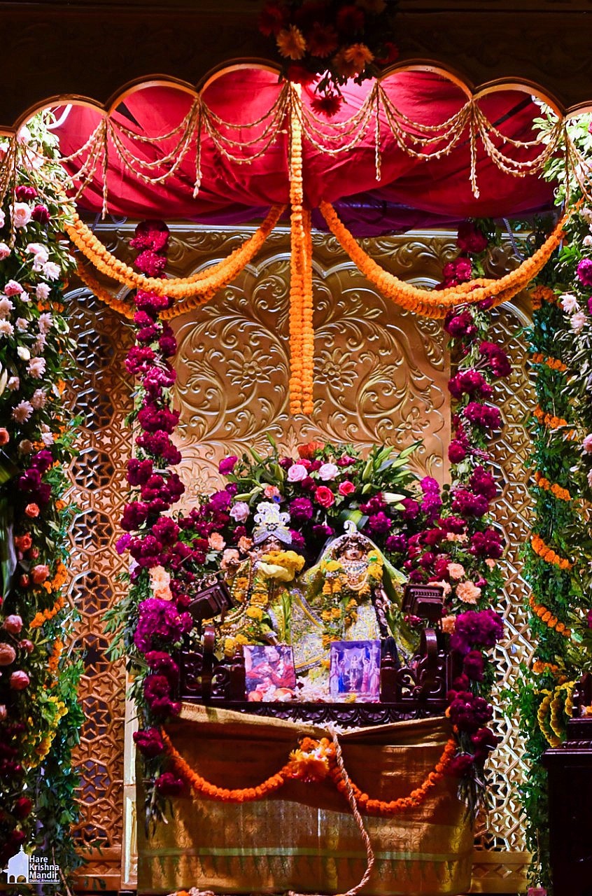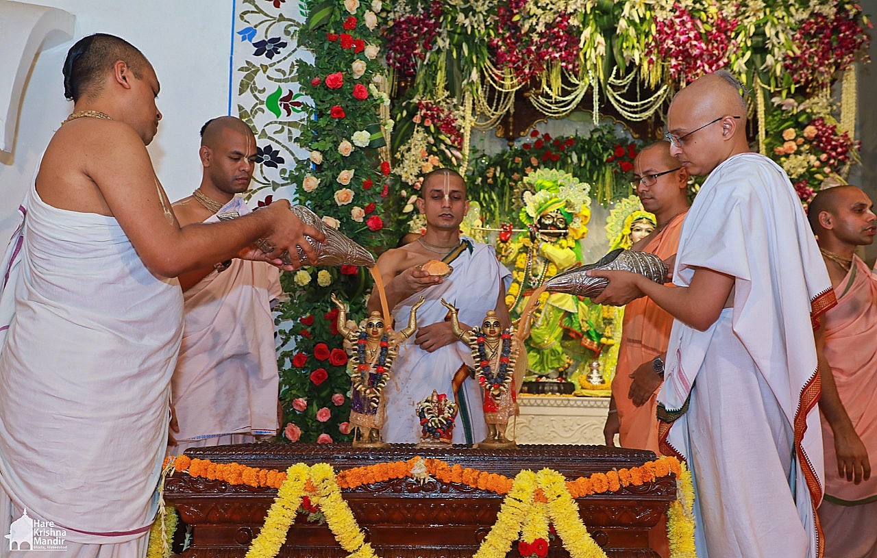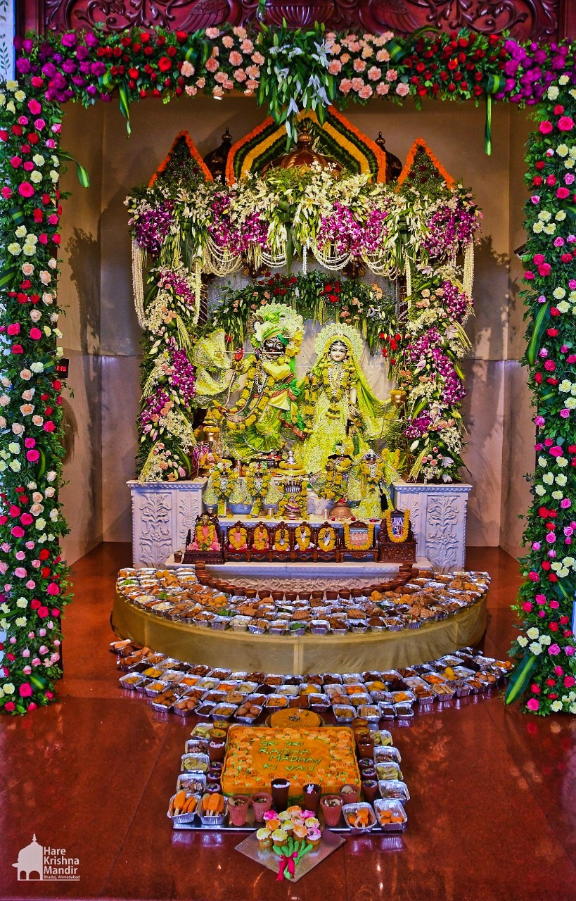 14th May, 2021, the Akshaya Tritiya day, marked the beginning of 3-day Patotsav festival that commemorates the appearance of Their Lordships Sri Sri Radha Madhav at Hare Krishna Mandir Ahmedabad.. Churnabhishekam Seva was offered to all the Deities of the temple, Sri Sri Radha Madhav, Sri Sri Nitai Gauranga & Sri Sri Lakshmi Narasimhadev. Chrunabhishekam is a grand ceremonial bath to the Deities with special churna (powder) of sandal & turmeric. During the Rajbhog, 108 food preparations were offered to the Deities.