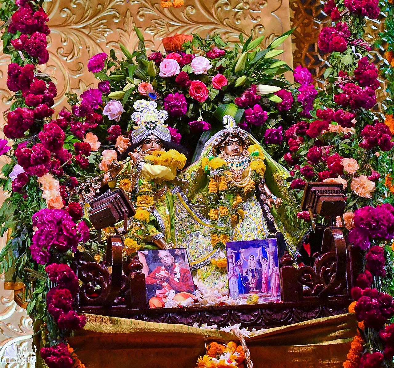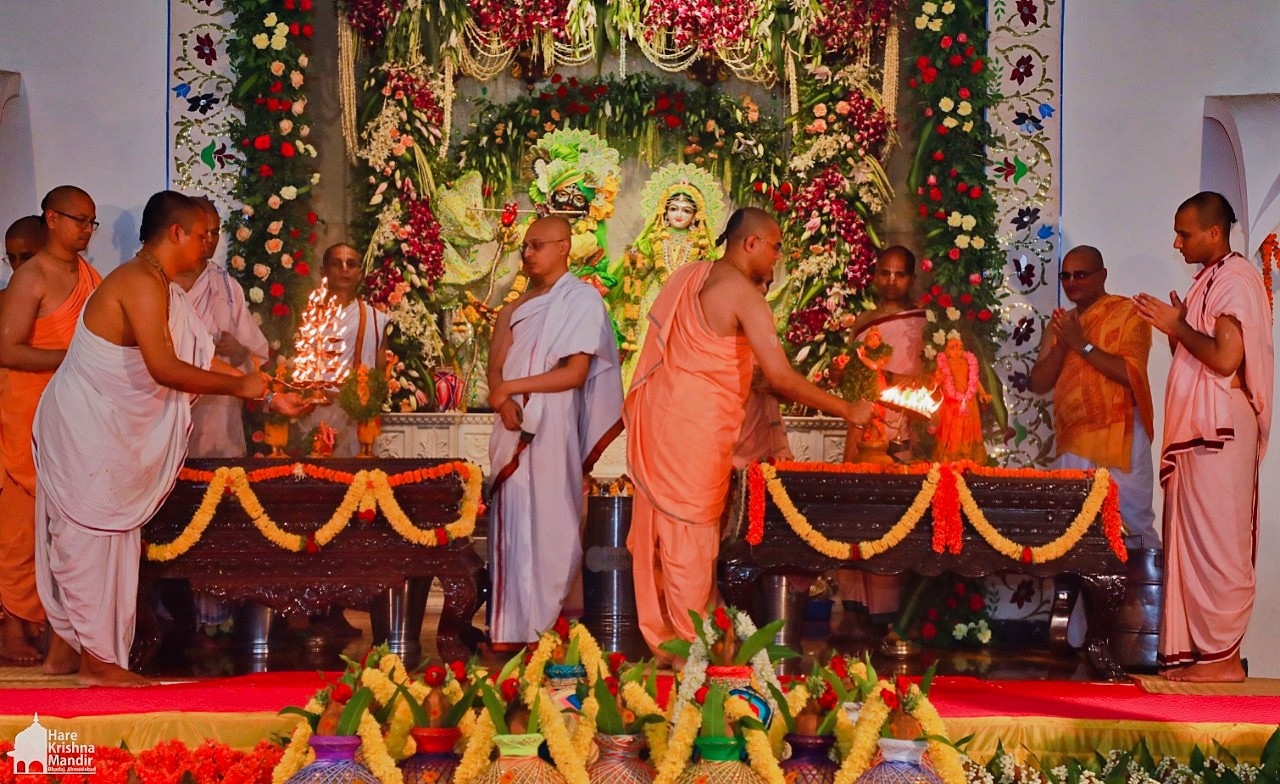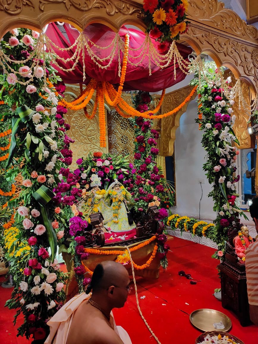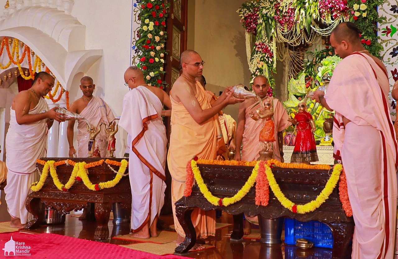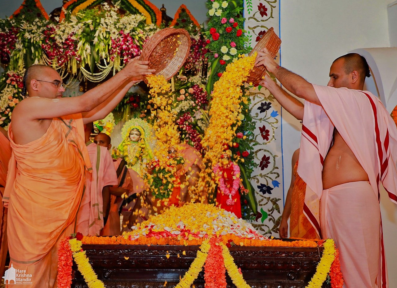 14th May, 2021, the Akshaya Tritiya day, marked the beginning of 3-day Patotsav festival that commemorates the appearance of Their Lordships Sri Sri Radha Madhav at Hare Krishna Mandir Ahmedabad.. Churnabhishekam Seva was offered to all the Deities of the temple, Sri Sri Radha Madhav, Sri Sri Nitai Gauranga & Sri Sri Lakshmi Narasimhadev. Chrunabhishekam is a grand ceremonial bath to the Deities with special churna (powder) of sandal & turmeric. During the Rajbhog, 108 food preparations were offered to the Deities.